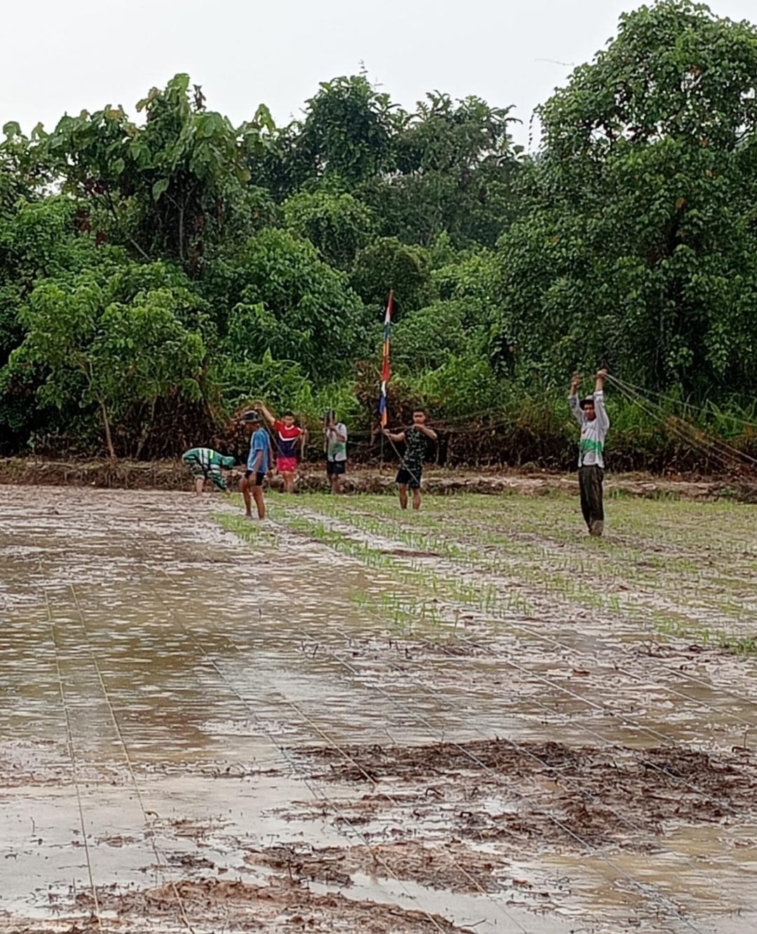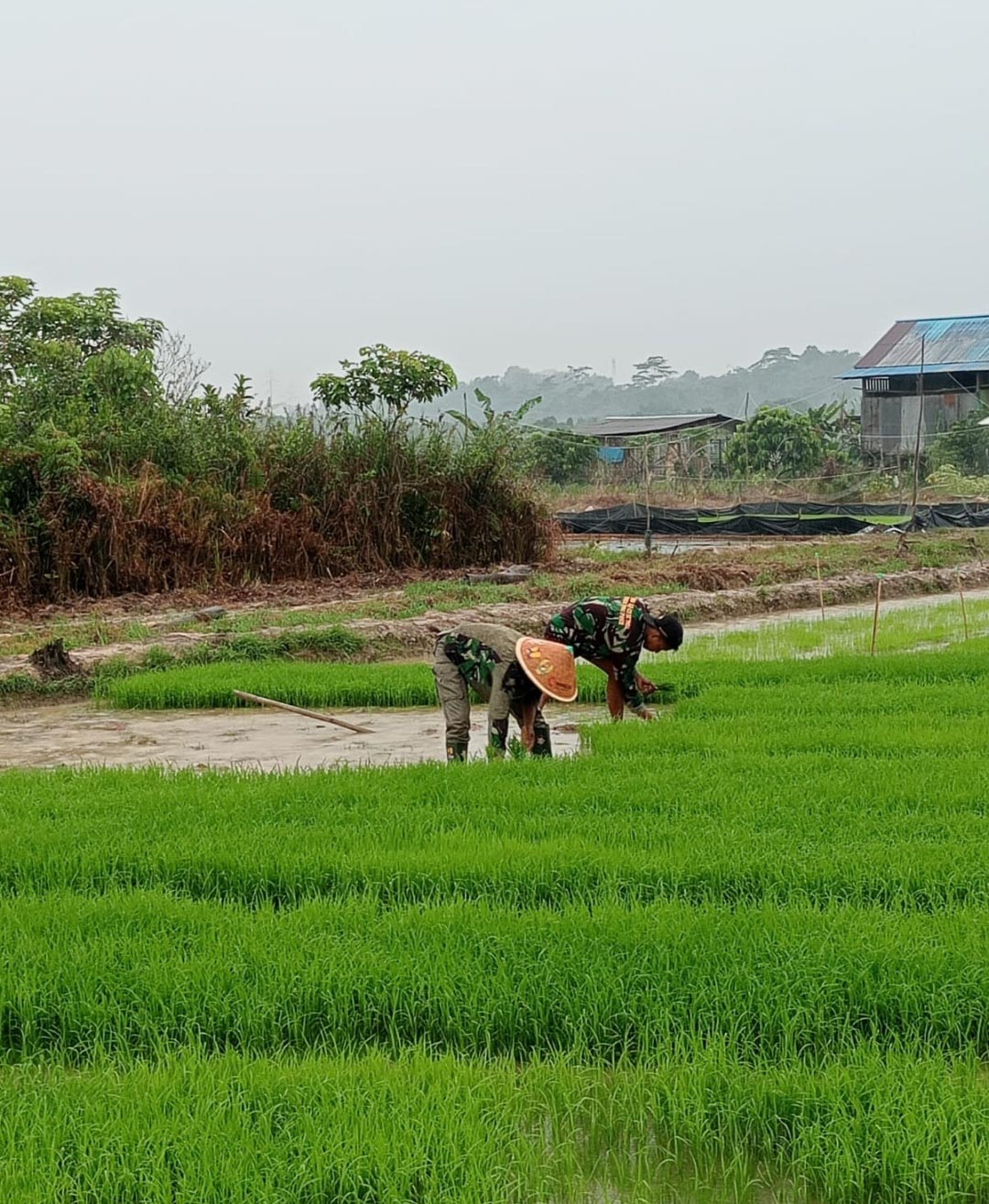 Dari kejauhan, tampak personel Satgas bekerja bahu-membahu bersama warga setempat dalam kegiatan penanaman padi secara gotong royong. Kegiatan ini tidak hanya mempererat hubungan TNI dan rakyat, tetapi juga merupakan bagian dari tugas Satgas TMMD dalam mendampingi dan membantu masyarakat, khususnya di bidang pertanian. Kegiatan ini sejalan dengan program Ketahanan Pangan (Hanpangan) yang dicanangkan oleh Kepala Staf Angkatan Darat (KASAD), Jenderal TNI Maruli Simanjuntak M.Sc.