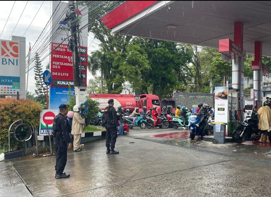 Porosnusantaranews,BALIKPAPAN - Anggota kepolisian dari Batalyon A Pelopor Satbrimob Polda Kaltim mengatur dan menertibkan pengendara motor dan mobil yang mengantre untuk mengisi bahan bakar minyak (BBM) jenis Pertalite di salah satu SPBU di Balikpapan, Kalimantan Timur, pada Rabu (21/5/2025).