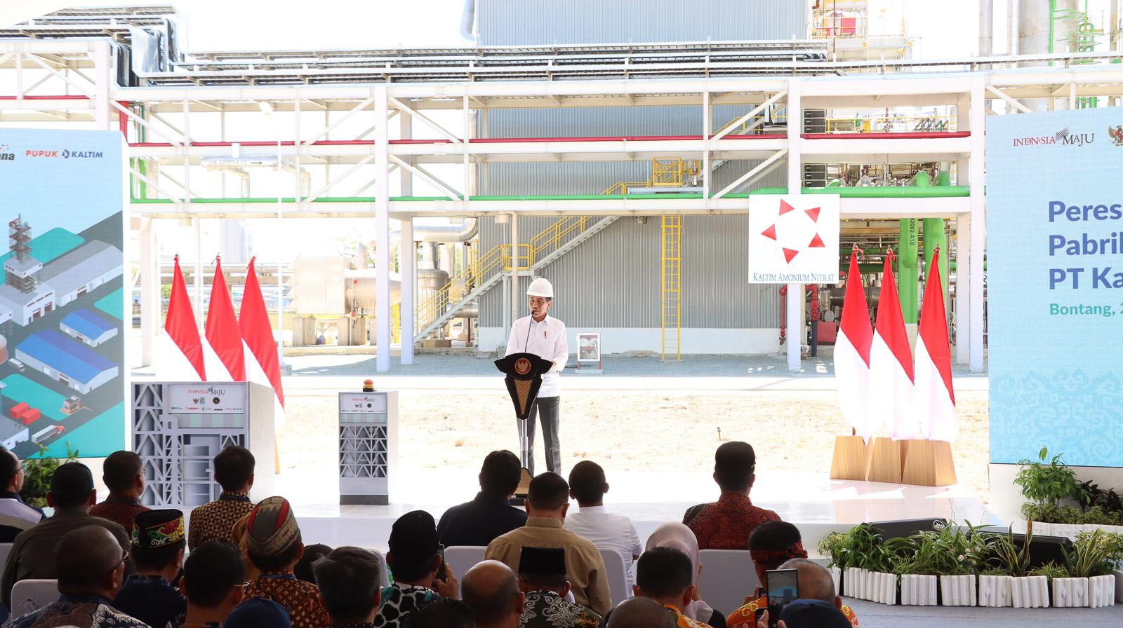 Dalam sambutannya Presiden Joko Widodo mengapresiasi upaya keras Pembangunan Industry Ammonium Nitrat karena 21 pesen masih impor.