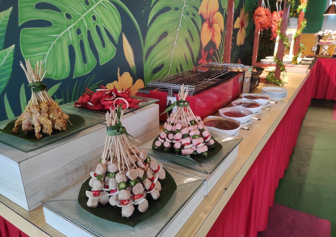Tak hanya itu, tamu juga dapat menikmati sajian suki dengan pilihan kuah tomyam dan kaldu ayam, soto Betawi, stall bebek peking, ayam Hongkong, hingga aneka barbeque seperti beef belly, sayap ayam, dan sate-satean. Menu utama lainnya meliputi nasi putih, bihun goreng, capcay goreng, ikan nila kuah gulai, serta ayam Singkawang. Untuk pencuci mulut tersedia semangka, pepaya, aneka puding, es melon, kolak campur, healthy drink, teh panas, dan air mineral.